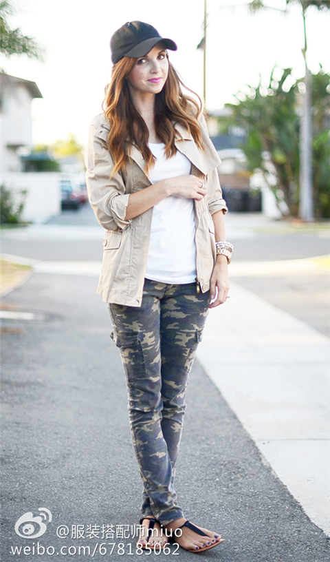 下摆有蕾丝边的白色连衣裙,配上军工外套。虽然两个单品一个淑女清新,一个休闲帅气,但是组合在一起却别有味道,你可以注意下,每年的春秋季的时尚杂志里,总会有军绿外套