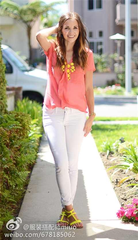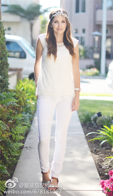 白色上着也可以和白色下着搭配起来~但是大家注意,下图中虽然上衣和下着都是白色,但是上衣的面料是雪纺蕾丝的,和裤子的面料不一样,所以两者的视觉感受也是不同的,这样才不会显得过于平乏单调。