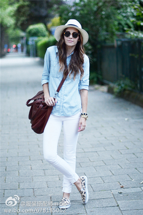 因为是基础款,所以很百搭。同样的白裤子,搭配休闲的牛仔衬衫可以,搭配淑女的雪纺衫也可以。但是不要只看模特的衣着,同时也注意下她的鞋子。穿着下图中这种踝靴时,依然建议大家不要让裤脚和鞋口堆起褶子,最好能够把裤脚卷起一些,露出一小截脚脖子。这样能显腿部利落。