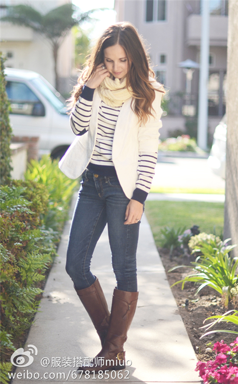 故意把西装袖子挽到手肘、露出内搭的条纹针织衫袖子,这样会呈现一种随性的感觉。再配上牛仔裤和棕色长靴,这两件单品本身就有浓浓的“西部牛仔”的感觉。那么这一身整体休闲的风格就出来了。和上面的几套感觉很不同了。