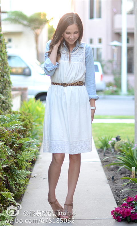 把蓝色衬衫穿在白色背心裙里面,色彩组合好像蓝天白云,色彩上就很能博得好感了。因为连衣裙比较宽松,所以在腰间系一根腰带体现腰身。