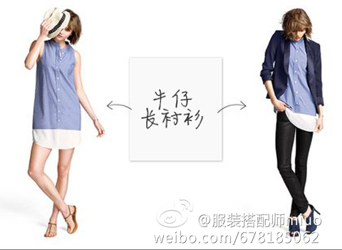下图中的示例用的牛仔衬衫,其实你还可以用格子衬衫、纯色衬衫、雪纺衬衫等替代。只是需要注意,衬衫的款式和版型必须是休闲款的,可不要拿收腰的制服衬衫来这样穿,会显得不伦不类。