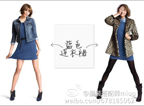 同样的蓝色针织连衣裙,可以单穿、可以搭配牛仔外套,也可以搭配豹纹厚外套。
