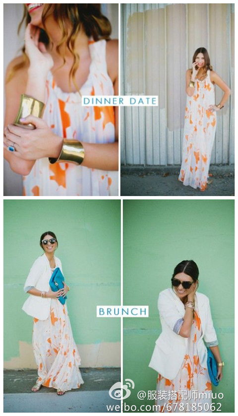 你还可以在雪纺、真丝、T恤类的连衣裙外面搭配收腰的小西装,调整下发型和配饰、包包、鞋子等配件,那条夏天穿去海边、旅游、度假的飘逸连衣裙,转眼就可以在秋季时穿着去约会、聚会、逛街了。