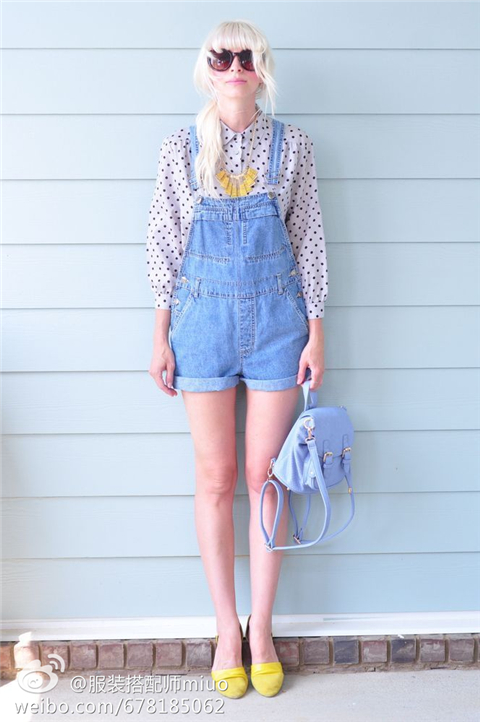 平胸穿背带裤背带裙,要比胸部丰满的穿好看。下图这身搭配中,鞋子和项链都是柠檬黄,与牛仔裤和包包的蓝色互为补色,色彩对比很强烈。但是要注意:即使是撞色,也要有主有次,一种颜色面积大,另一种颜色的面积就要小,就像这套搭配中,蓝为主、黄为次,这样就凸显了黄色,蓝色也被衬的很鲜亮。