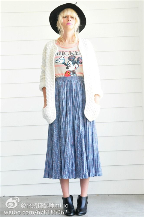 下图中的搭配,是由一件卡通T恤 一条长裙 一件长款针织开衫 一双踝靴组成的,简洁、好看、遮肉、时尚,大家也可以照着试一试。