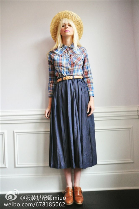 格子衬衫也算是经典基础款了,藏蓝色百褶长裙,也是基础款,这两件单品组合在一起,再配上棕色腰带、棕色巴洛克皮鞋,很有复古文艺范。