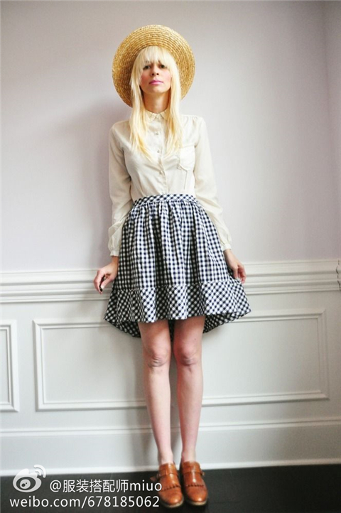 简单的格子半裙,配上巴洛克小皮鞋,其实这身搭配之所以呈现出“复古”感,全靠了脚上的那双鞋子,如果模特穿的不是巴洛克小皮鞋,而是匡威帆布鞋呢?感觉最多是小清新,而没有“复古”味了。