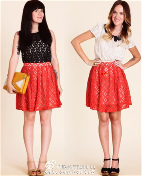一条红色蕾丝裙的两种搭配方案!很多妹子会对红色、黄色、橙色之类的鲜艳的非基础色无所适从,不知道该配什么颜色。但事实上,当你不知道一件非基础色的单品该如何搭配时,选择黑色、白色去配,总不会出错!看下图,即使是时尚达人,也是把红色和黑色白色配在一起。