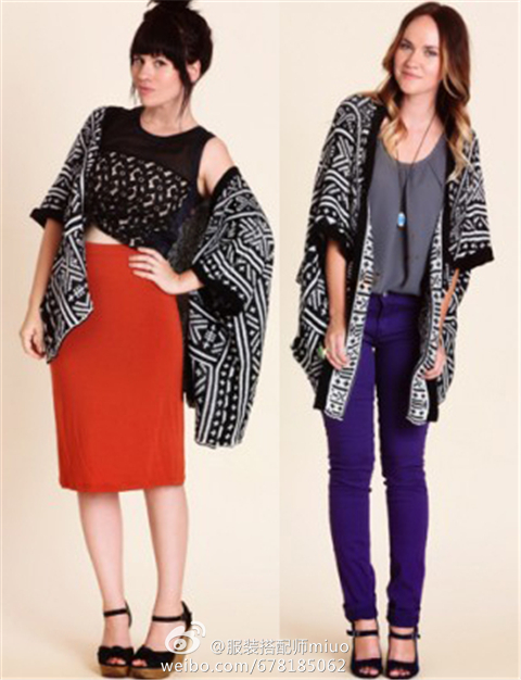 一件民族风雪纺外套的两种穿搭方案。注意下,之所以这件民族风外套既可以搭配红色的裙子、也可以搭配蓝紫色的裤子,是因为它虽然看起来花哨,但事实上上面的图案只有黑白两种颜色!而黑白色是超级百搭色,所以,这样一件看似复杂、又非基础款的雪纺外套,却能和你衣橱里的很多单品搭配起来!
