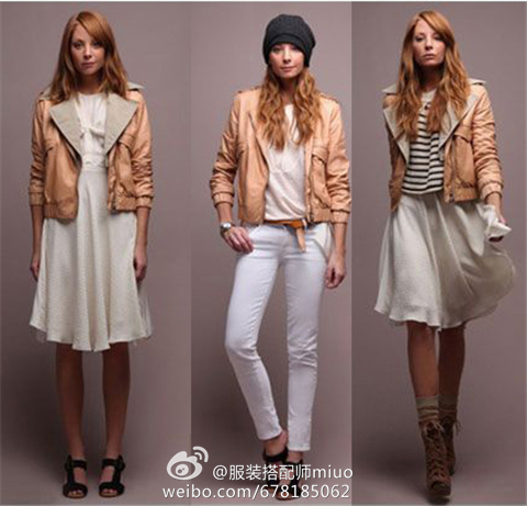 下面是一件浅驼色小皮衣的三种搭配方案。大家可不要因为这三套搭配,就觉得这件皮衣很百搭了,因为难道你没有发觉:模特的内搭、下着,都是浅色系的吗?