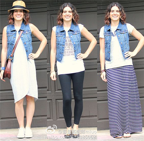 像开衫马甲类的单品,它们的作用与其说是“保暖”,不如作为“装饰”,更加合理些。为的就是增添搭配的“层次感”。比如下图中的第三套搭配:牛仔马甲+T恤+条纹长裙,若是没有那件牛仔马甲,那么模特的身材比例就被她的T恤和条纹长裙硬生生地分割成了1:1,而套上一件牛仔马甲后,身材比例就有了很大的改善,层次感也分明许多,甚至有一定的遮肉作用。