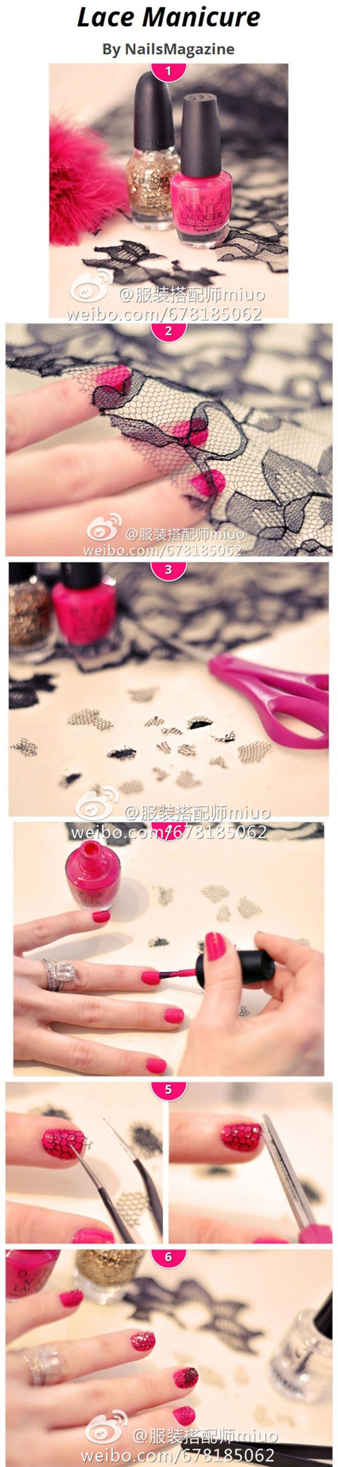 这个方案我觉得特别好看!但是要注意的是,蕾丝的颜色最好和指甲油的颜色对比强烈些,才有效果哦~