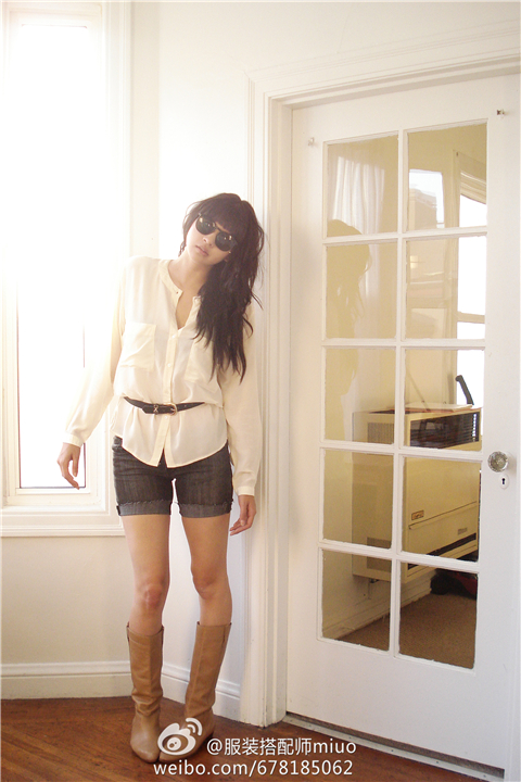 比如热裤配上长袖T恤,再来双高帮鞋或者休闲款的长靴,就是很好的组合。