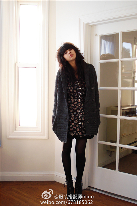 连衣裙+针织开衫时,注意色彩的搭配。