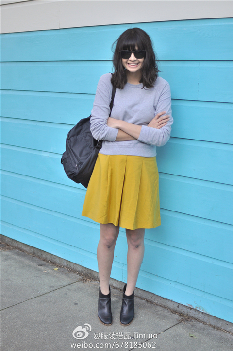 姜黄色的百褶短裙,配上简简单单的灰色卫衣和黑色双肩包,非常适合学生族。