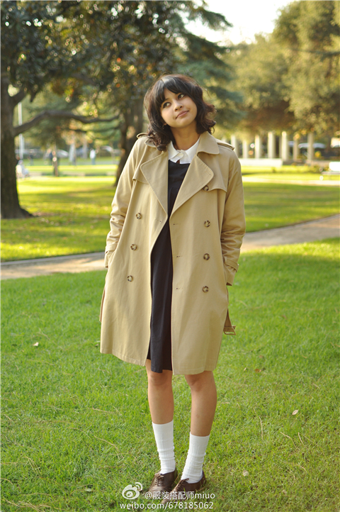 虽然风衣给人白领+成熟的感觉,但是你露腿,再配上白袜子和平底复古小皮鞋,就很有日系小清新的感觉!!