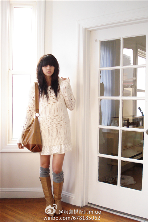 如果你的腿长得好看,可以搭配平底浅口鞋,如果小腿较粗,不妨试着配靴子,这样就很日系了~