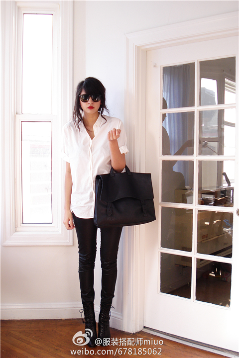 男朋友风短袖衬衫,把袖口挽起一点(即使是短袖衬衫,也把袖口挽起一点,这能让你摆脱“老气”)配上帅气的皮质感紧身裤和同色高跟靴,这能让你的腿部显得非常修长!