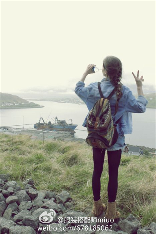 旅行时穿着,搭配大包、短靴、露腿或者紧身leggings,给人很自由自在的感觉。