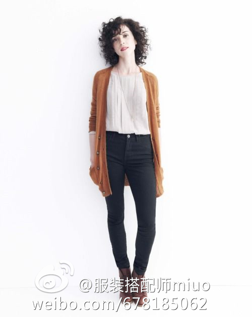 如果你觉得自己胯部比较宽阔、而小腿又比较细、穿着小脚牛仔裤会让下半身看起来好像一个倒锥形(常见于明显的沙漏型身材),那么你可以搭配一件长款开衫,让长长的开衫收敛宽阔的胯部。(如下图)