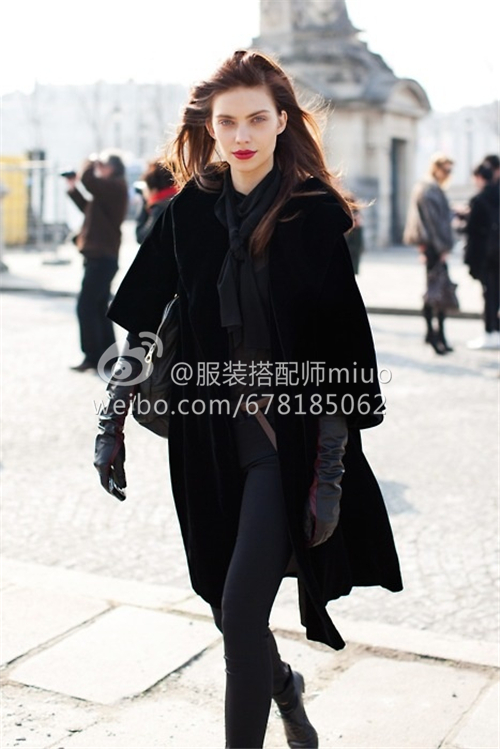 比如下图中,模特的大衣是黑色,内搭了深灰色的围巾和打底,这就是色彩的层次感。统一中有细节、有质感。