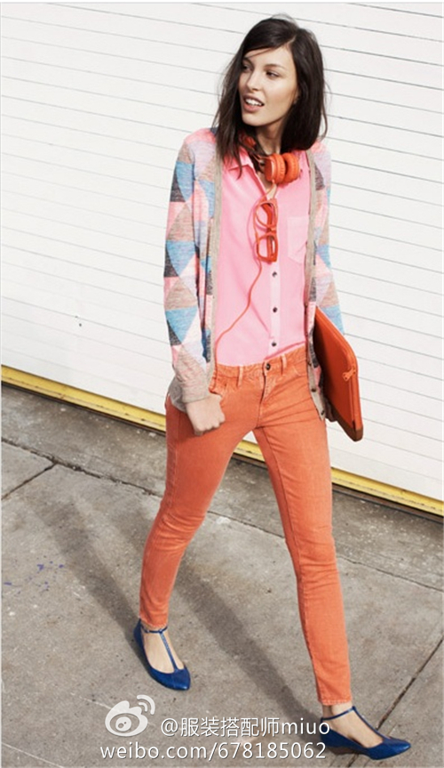 大家可以看下面这张街拍,模特身上的颜色很丰富,衬衫玫红、裤子耳机等橘色、鞋子宝蓝色、外搭的针织开衫上也有好几种颜色(淡蓝、粉橘、白色、深灰、浅灰、灰白、白色),其中,淡蓝和鞋子的宝蓝色属于一个色系、橘粉和裤子橘色是一个色系,再加上衬衫的玫红,大家可以想象下:蓝、橘、玫红,这三种颜色在一起,明明应该是很艳丽、很撞色的组合,为什么这身搭配的配色却没有这种感觉呢?
