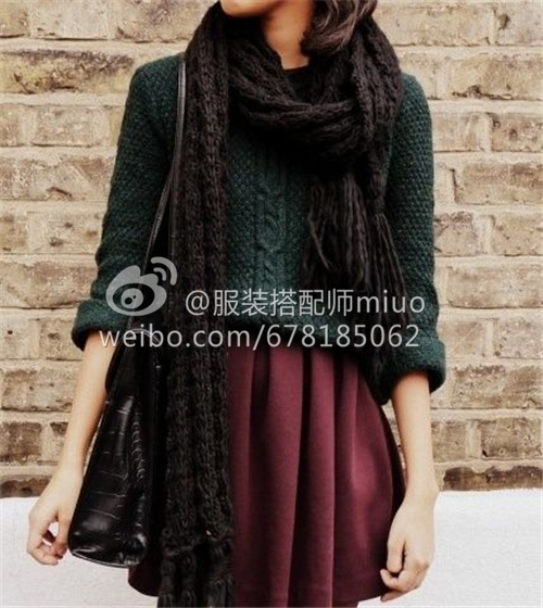 下图中,若只有墨绿的毛衣+暗红的裙子,不免太单调。