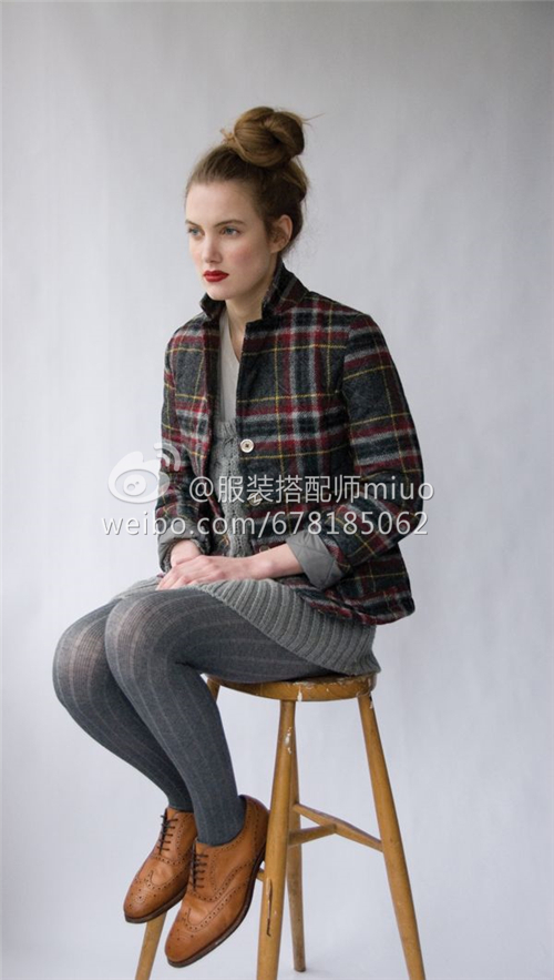 下图中,模特身穿的格子外套里有深灰和浅灰、内搭的毛衣是铁灰色、裤袜是中灰,这看似简单的搭配,为什么觉得好看?