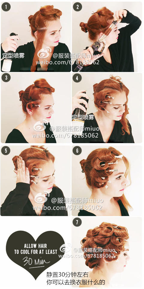 这个看起来难,实际上非常简单,把头发一缕一缕地用卷发棒烫软,然后用鳄鱼夹卷起来固定在头顶(如果你就是想要这个盘发的效果,那可以用一字夹来固定)。这个只需个做大波浪的过程,不需要弄一丝不苟的。最后记得一定要喷定型喷雾!