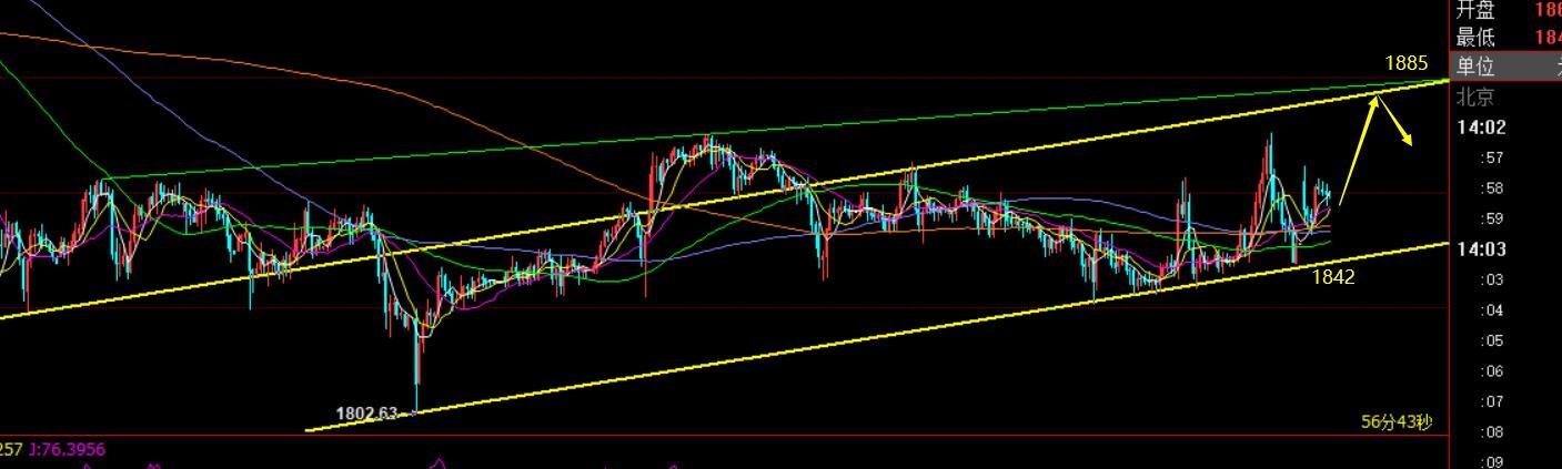 第一,隔夜倒V冲高回落,凌晨横盘压制1845美元,而当小时线级别,大阳突破站上1845时,就意味着走势从弱转为震荡偏反弹,因而回测确认1845就是跟多的时机,一路冲击1875美元;