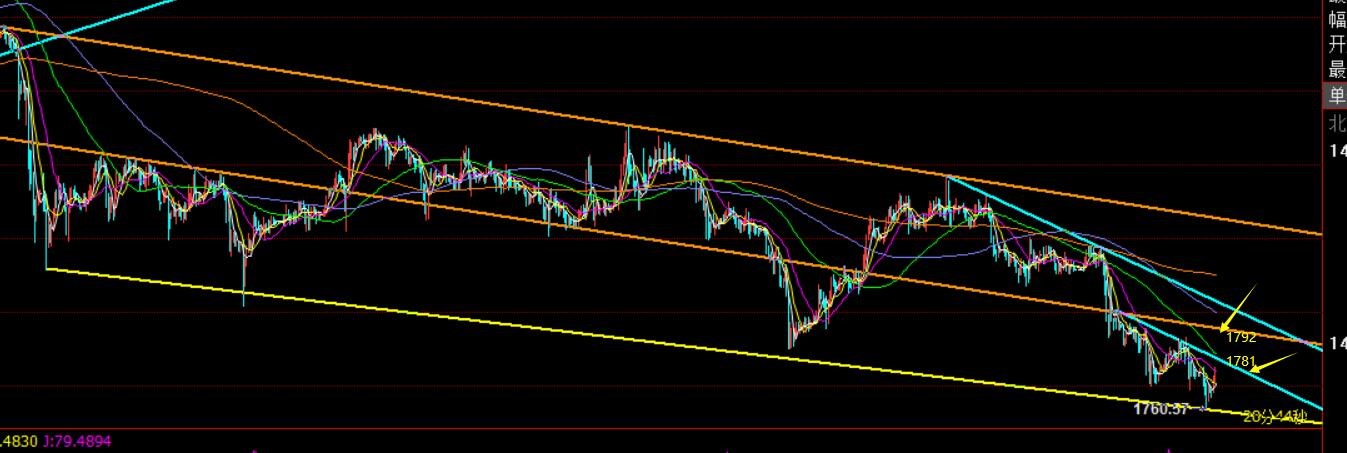 第一,黄金周线中期方面,当前价格有所刺破趋势通道支撑,是否类似去年3月份出现的一次一样,刺破后,迎来上涨,还有待进一步的收盘后以及下周形态收盘来决定; 通道的下轨支撑1780附近破位,下一个周线支撑是66日位置1750一线;