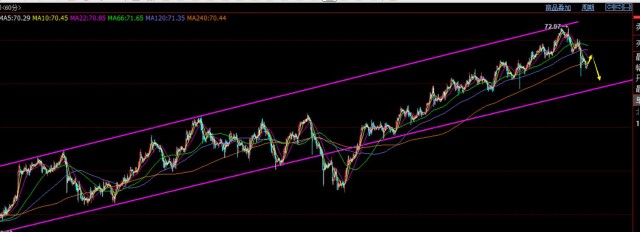原油方面:前期一路做多,一路获利,基本都是依托小时线66均线或4小时中轨触及多,昨日早盘续跌,午后又回到66日均线上方,就给出71.8跟多,盘整了一天,最高才触及72.2,到了美盘期间,由于盘整时间过长,该发力的时间点不发力,就容易出问题,提示71.9保本出,果然没过多久迎来一波急跌至69.7一线,这也说明前日判断73通道上轨会出现承压调整思路是正确的,原本昨日再二次试探73去反手布局做空,给不到机会,今日则要提前布局空,点位上关注71.3美元,触及逢高空,看69.7-68.5,如果是新合约报价的,对应位置减0.3左右即可;