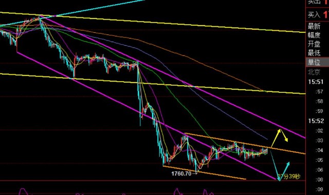 第三,黄金小时线级别,早盘开盘又是先拉升,这也本周三日以来循环发生的,并且14点这个小时也是循环出现一波急跌,区别就在于急跌后是欧盘先反弹回落,还是先回落拉升的区别,另外,美盘21点前后也会循环出现一波下探,上下震荡走势注意时间点的把握会好些;此时上方承压由1797、1790、1784所连接的趋势线阻力,这里能否压制决定欧美盘的强弱;若始终承压,短线则偏弱运行,那么就大概率会试探1760底部几率;反之,若突破站上,则形成反弹,有概率试探1797前高点,以及下一个趋势阻力1803-05;