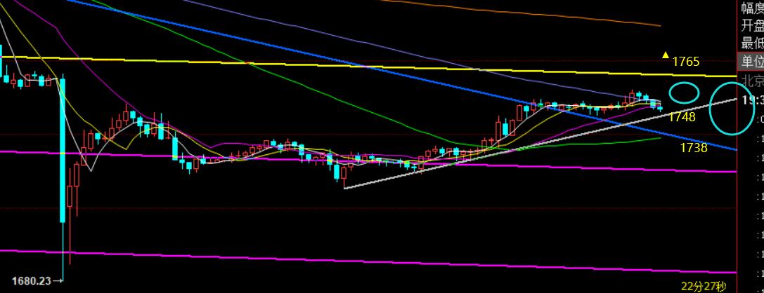 第一,黄金日线级别,昨日收报一根大阳,且突破了短期5均线压制,因此判断今日会有延续反弹的动能,上方短期压力则是19年以来的那条趋势线承压,前期是支撑,当前成为阻力,即1765一线,刚好也是本周一大阴的开跌口,由于前面是断崖式下挫,这两天反弹确认完毕,后续则是打压再次试探底部的时机,建议1765下,选择高空为主;
