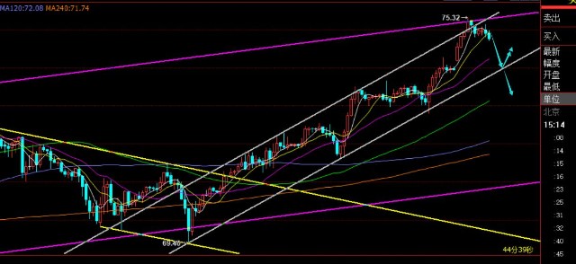 原油方面:早间开盘跳空高开拉升,缺口存在,一般容易回补,因为近期走势还并未极强上涨的那种;只不过,跳空拉升的力度比预期稍大些,刺破了白色上升通道的上轨,但承压了紫色通道上轨,另外,个人认为缺口未回补的情况下,急于先大幅拉升,一旦回补缺口了,反而容易继续下破,扩大跌幅,也就是说,本周需留意原油的跳水见顶; 阻力75.3一线,支撑73.9,建议反弹空,破73.9有效,则延续下滑调整;