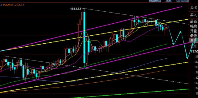 第三,黄金小时线级别,隔夜震荡反弹一波,凌晨横盘支撑于1804上方运行,今日早盘有所压制下滑至1801一线,从通道来看,重新破位回归于图中黄色上轨下方,当前预计白色短期趋势线有逐步承压迹象,只要始终保持此两通道下运行整理,那么有可能会逐步慢下行测试紫色通道的下轨位置1795-94一线,破位才能测试黄色通道位置1786-88,这是个人对于今日的预期判断,认为会震荡氏下压,至于低点哪里,则关注途中各通道的支撑得失即可,前期就是不能再刷新早间高点;