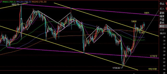 操作上:激进的以1800为防守,去试探短空,稳健可等待非农前后,若一直压制1800下,则尝试高空,或者1805下触及高空,目标统一看1782-80、1770下;