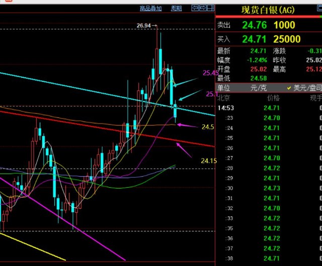 第二,白银方面,25.4支撑失守,指出下一个测试的支撑点是25一线,此位置首次触及快速反抽至25.45一线,后半夜再次打压至25,就意味着支撑难以坚守;