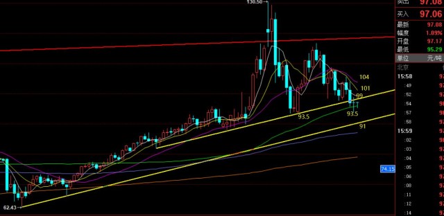 今日早盘给学员计划95一线尝试多,可惜价格只触及95.3一线,差一点,从小时线macd底背驰以及多头放量酝酿来看,价格再走低下行破底概率不大,存在一定反弹修正动能,建议拉低多尝试;支撑95上下位置,93.5作为一定防守,短期看反弹目标至99,站上看101一线; 同时,若给到91附近极限点中期做多,目标千点以上;