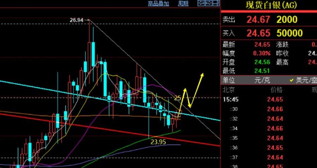 白银方面,日线级别可以说是缩口三角末端运行,通道阻力压制于24.8-25,支撑于24一线;从回补上周二长下影完毕角度看,企稳24是可以看一波上攻,站稳25则可以冲击25.8-26概率;若守不住上周二23.95低点,则再去看走弱调整一波,同样也是小概率,做好预备;