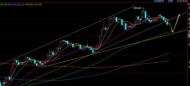原油方面,昨日白盘也会拉升,凌晨后下探,日线小十字K,依托日线5均线上运行,也是偏强对待,操作上继续保持看涨做多为主;当前上行通道下轨有所破位,暂时不急于多,留意紫色趋势支撑105.5一线,也是小时线66日均线所在,触及逢低可多,看新高或通道上轨112; 今日还是05合约报价;