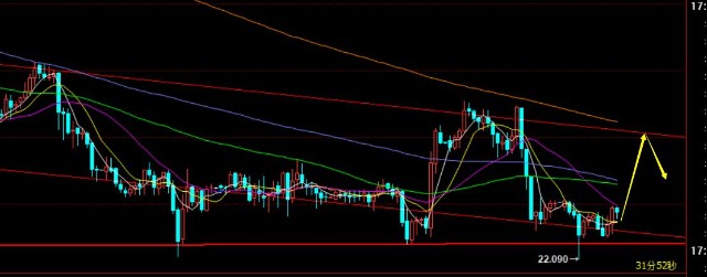 白银方面,早盘续跌再一次试探了22.2-22区域支撑,欧盘也有所反弹,短期阻力关注凌晨压制点22.55,能突破则关注通道强压23上下位置,支撑22.2-22,暂时区间内运行为主;白银运行明显比黄金弱很多,就可能存在刺破22的概率才会有所大的反抽动能,周线级别留意21.6上下位置的多重底支撑,能守住它,还是看好后市反攻上行;