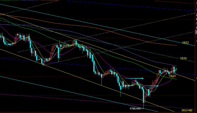 第二,黄金4小时级别,昨日底部支撑1786后,展开连阳上攻,此时处于短期10日上方,略破位中轨压力,短期有逐步上行的动能,上方关注三处承压,1835-36(分割反压力)、1842(通道反压)、1852(下降通道上轨压力),这需要结合视频解读才能明了,晚上有时间会录制下;而支撑则关注10均线1816处,建议逢低延续看反弹;