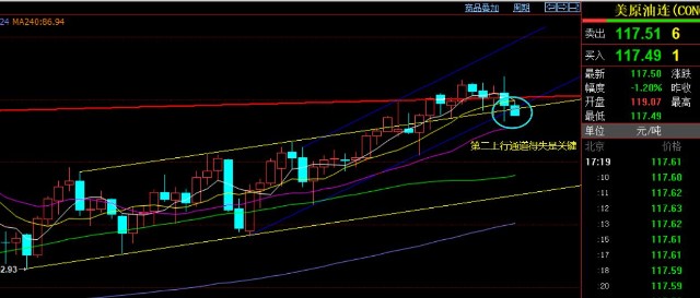 此时来看,日线级别,昨日刺破第二上行通道下轨支撑后反抽,今日形态很关键了,若是大阴处于通道下,则可能要展开一波回调需求;反之,探底拉升回归通道上方,则暂时继续117-123高位整理;从短周期macd来看,价格拉低破位116.6隔夜低点会产生一定底背驰,下方116一线有一定趋势线支撑,可围绕116一线去参与短多,阻力119.4一线,强压122下看压制,区间内运行;