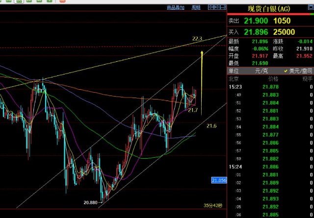 第二,白银方面,昨日路演明确指出21.3-21.4可去做多,最终也迎来一波拉升试探21.9一线;