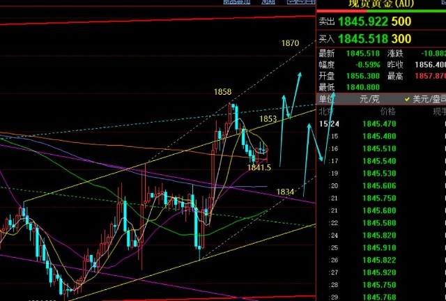 操作上: 1841.5逢低多单,可带好本钱一线止损,观察欧盘能否上去,阻力目标1847、1852、1858;突破站上1858再进一步回测看涨至1867-1870上; 若失守41.5,则1835-33上逢低再多一次,看1847一线得失;