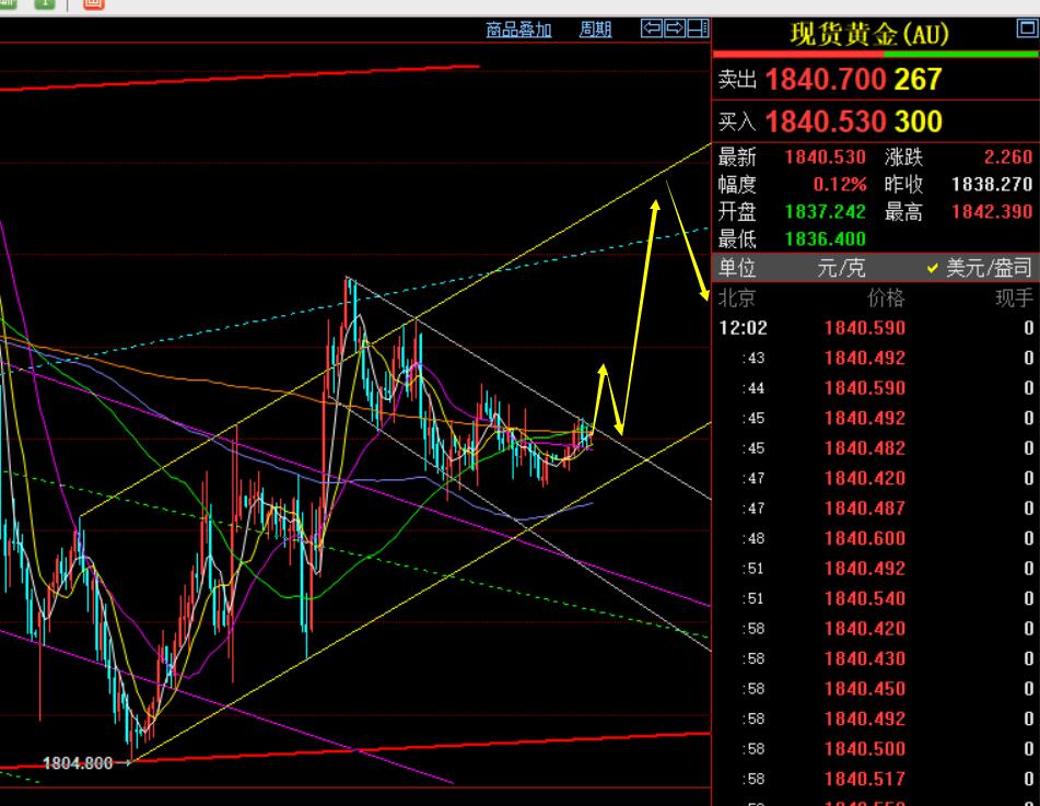 第三,黄金小时线级别:当前运行于1857.5-1852.8、1844.7-1840.8下降通道之内,而此时正在试探上轨压力1841.5一线,一旦午后大阳突破站上,则会延续反弹上攻;今日早盘从1836拉升至1842,从动能来看,是倾向于向上,同时1804.8-1816形成的趋势线也起到一定支撑作用;作为上周一波底部猛拉后,这两日维持震荡回踩修正,只要守住回踩低点1834不再下破,则大概率会有新的一波拉升,再去试探1858,甚至上破;