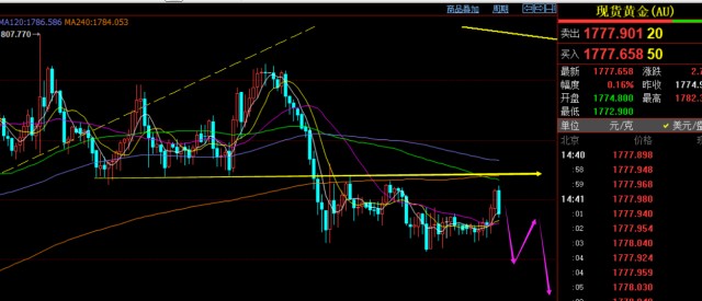 第二,黄金4小时级别:当前仍处于顶底压力1784-85下横盘震荡,随着中轨阻力逐步下压,预计整理之后会进一步的破底下行,下方关注年均线和半年线位置1765、1760;