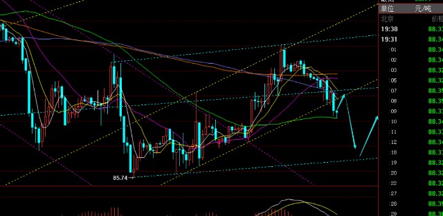 原油方面: 昨日没有符合预判继续底部压制弱势思路,而是一路逼空震荡走高,刚好把前高90.7给击穿,然后半夜压制91.4又开始一路阴跌回测,今日亚欧盘都是在慢跌格局中,多空也就进行了明显的洗盘行为;今晚关注89.4一线阻力,属于通道反压,支撑87一线下轨位置; 由于欧盘持续走跌,美盘若先反弹容易二次下行,因此89.4一线下承压可参与空试探,看87一线支撑; 若又重新回归89.4站上拉升,则会反复震荡再洗,冲击92上高度,届时也应该是日线下降通道关键上轨再次考验;
